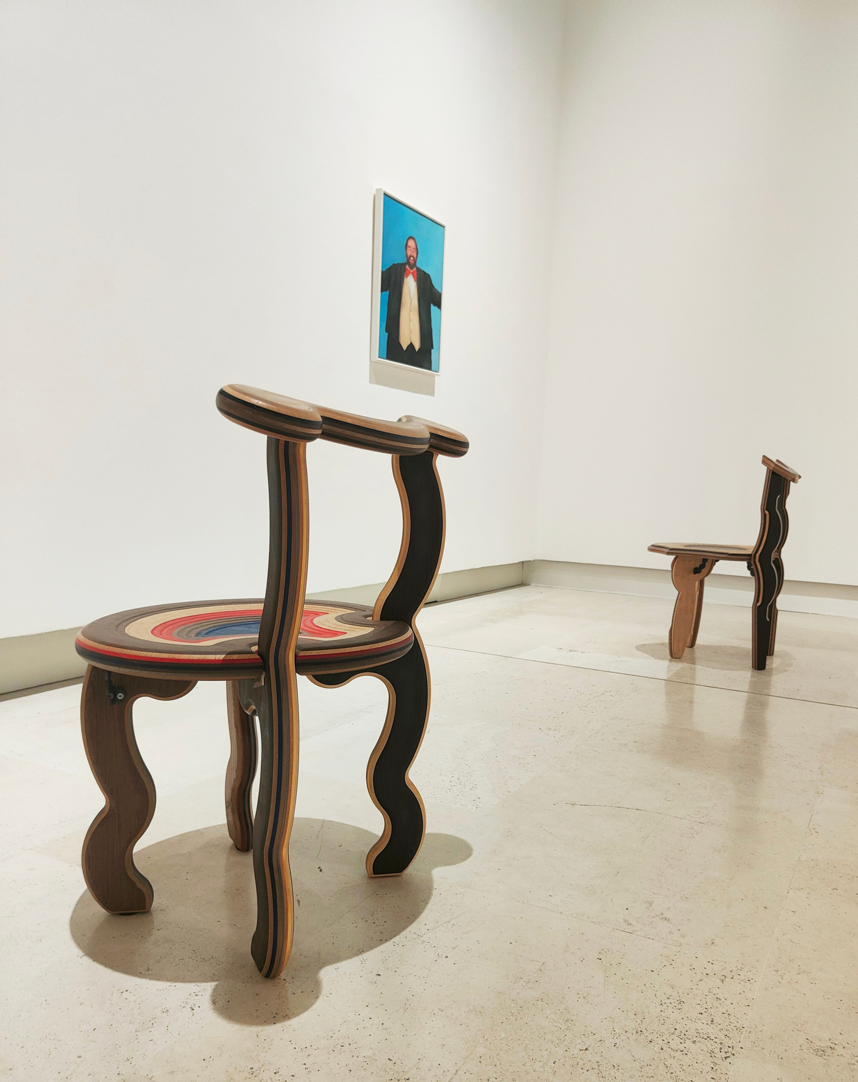 BRH+ definitely pulled this off, but not without some confusion. If you get hold of the printed exhibition plan, you can see that the five groupings are organized like an intertwined jigsaw puzzle, with one curatorial space backing into another, forcing one to walk around and around and then in and out to complete the intended sequence. Its ok, of course, I don't mind getting squashed under the huge mechanical arms of Arcangelo's “Hunger” machine chomping at the floor, while darting across the room to get to Sala 2 to catch a glimpse of Martino Gamper's “Sitzung” series of chairs. Francesco Stocchi's untitled section aims to get his team of artists to interact with each other, and somehow they do.